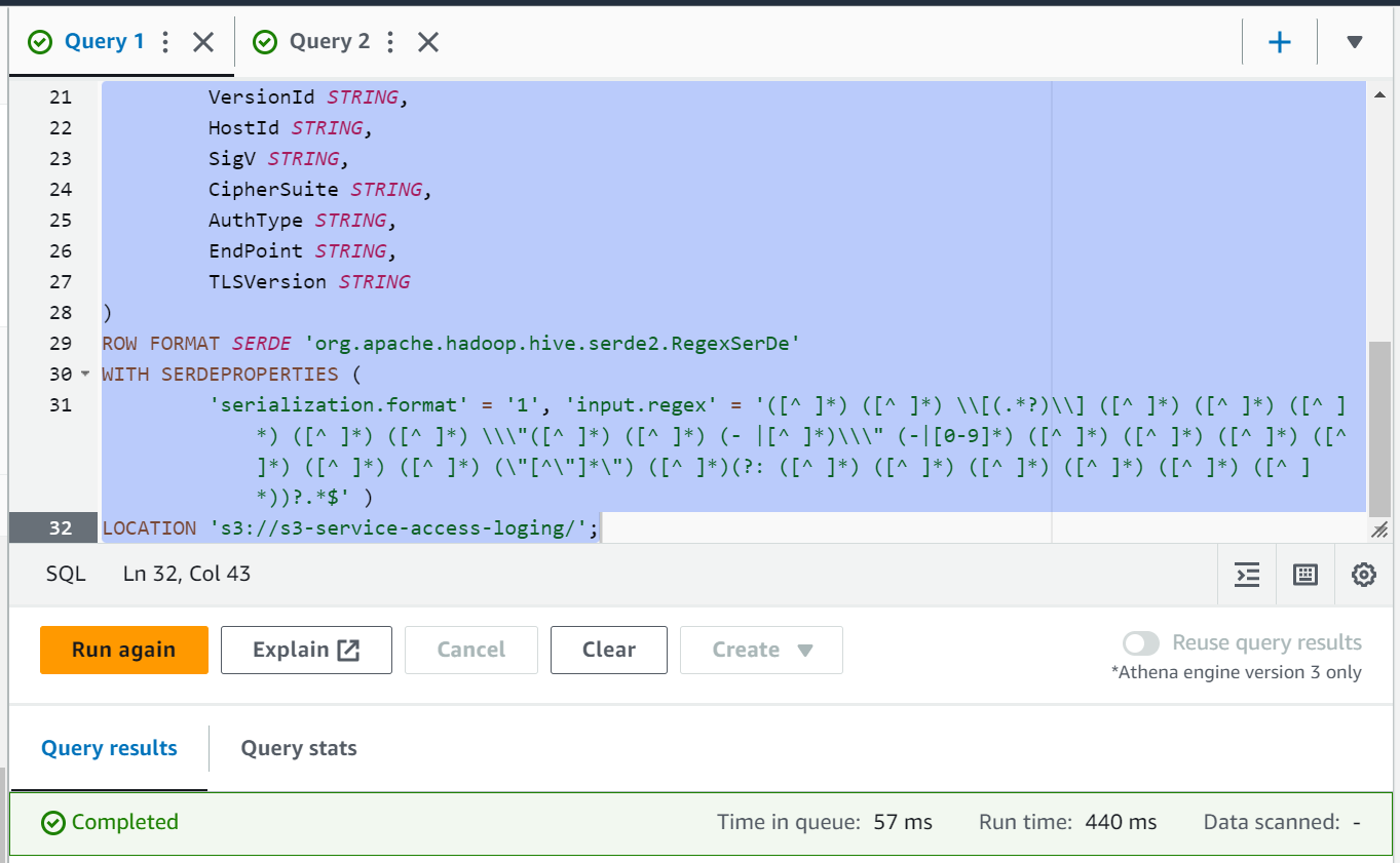 create database s3_access_logs_dbCREATE EXTERNAL TABLE IF NOT EXISTS s3_access_logs_db.mybucket_logs(