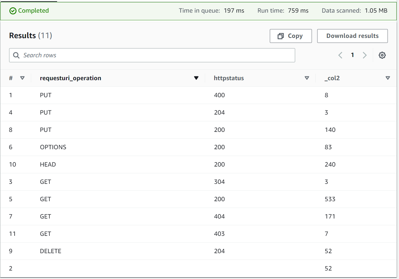 LOCATION 's3://s3-service-access-loging/';SELECT requesturi_operation, httpstatus, count(*)