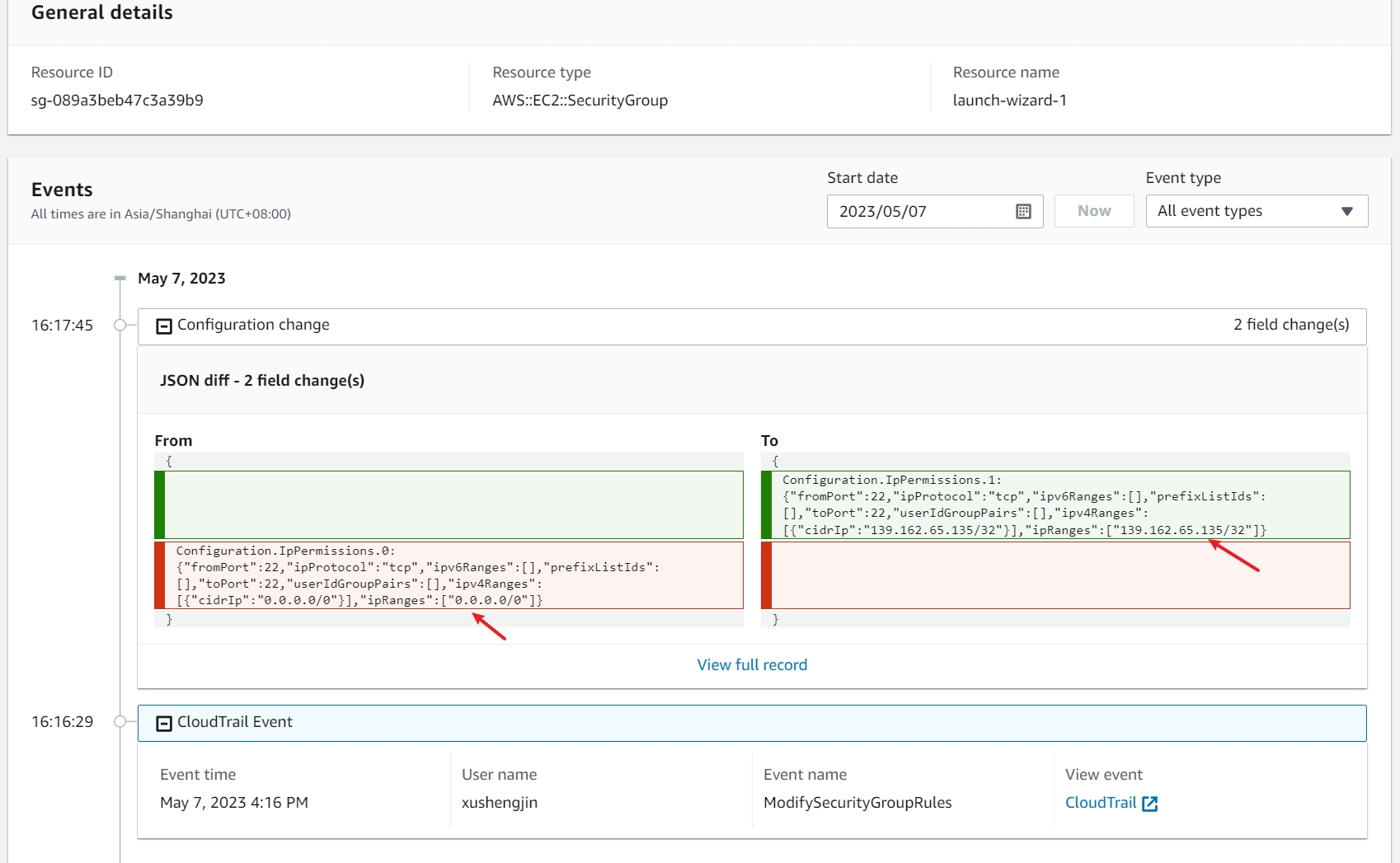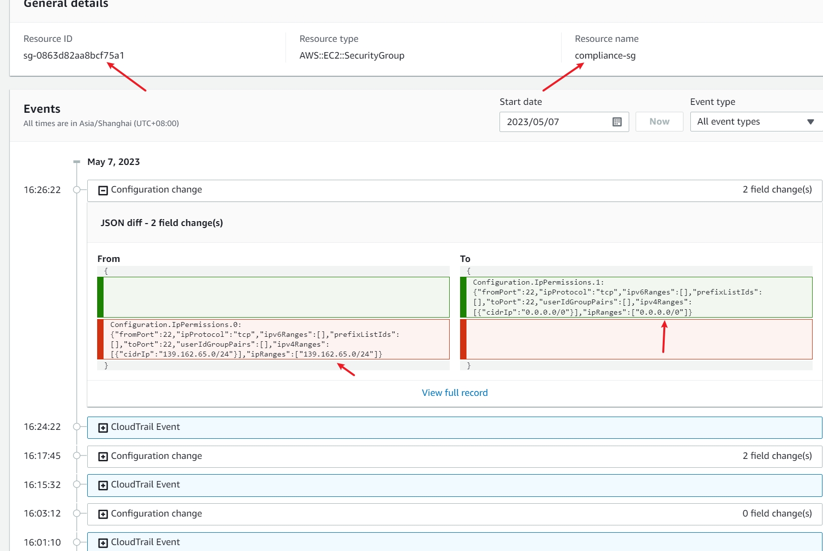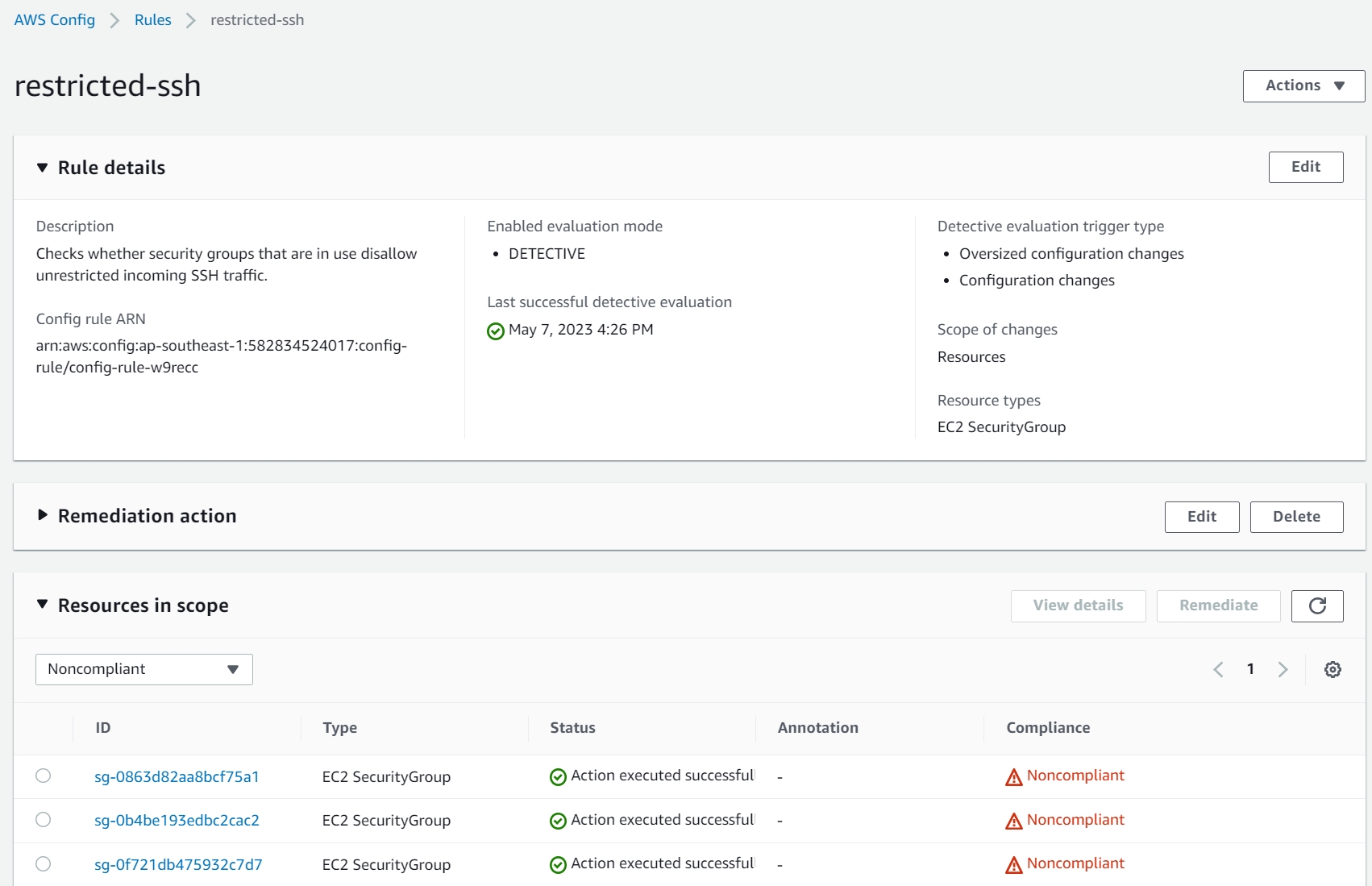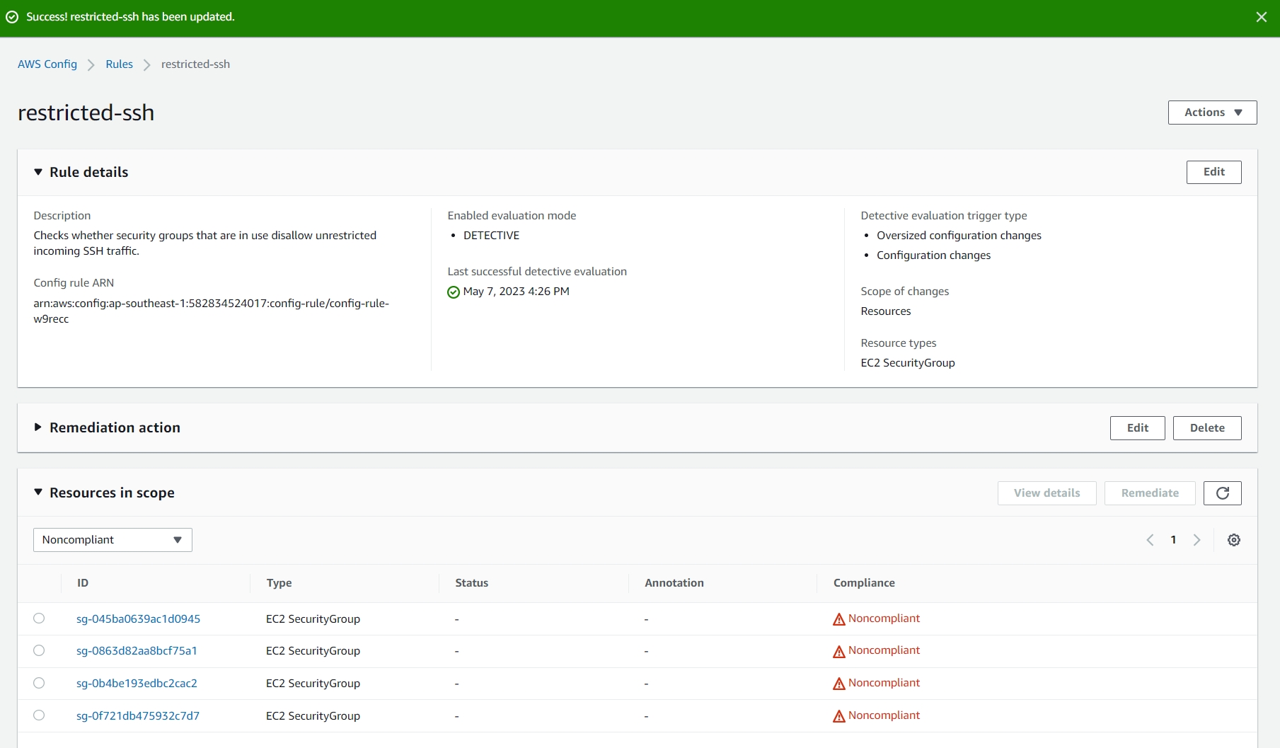 将 sg-0863d82aa8bcf75a1 - compliance-sg Compliant 的安全组 ssh 入站规则的 My IP更改为段(不会检测为不合规),以让他不合规。