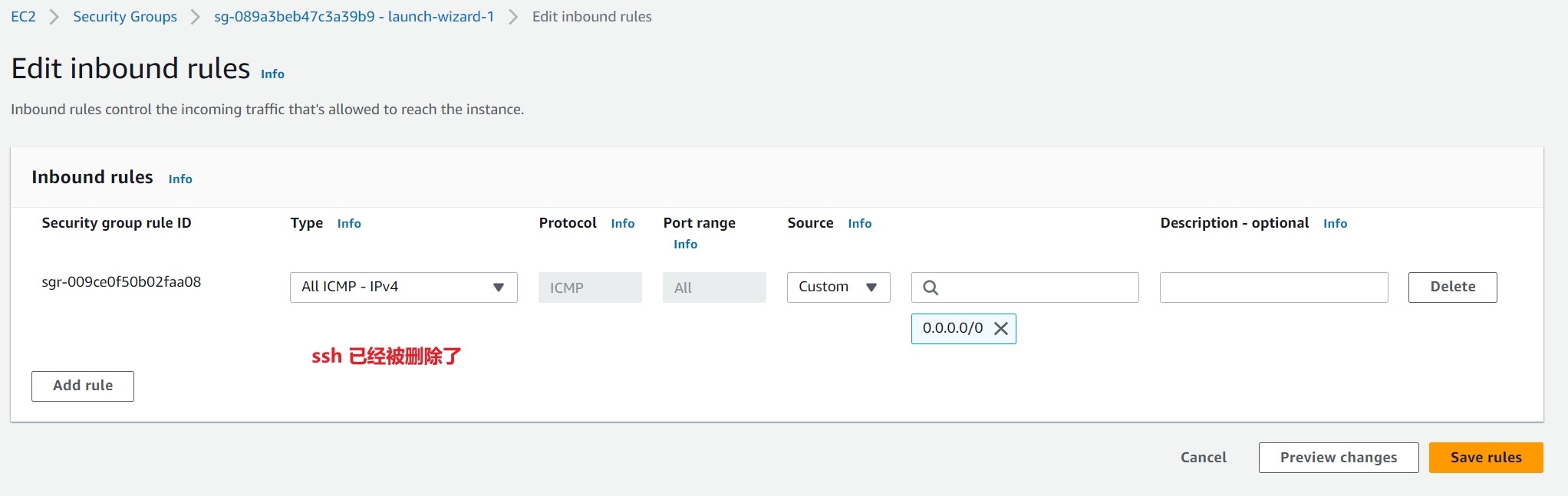当我们把 sg-089a3beb47c3a39b9 - launch-wizard-1 的 ssh 入站规则改为 0.0.0.0/0,看看会有什么变化。
