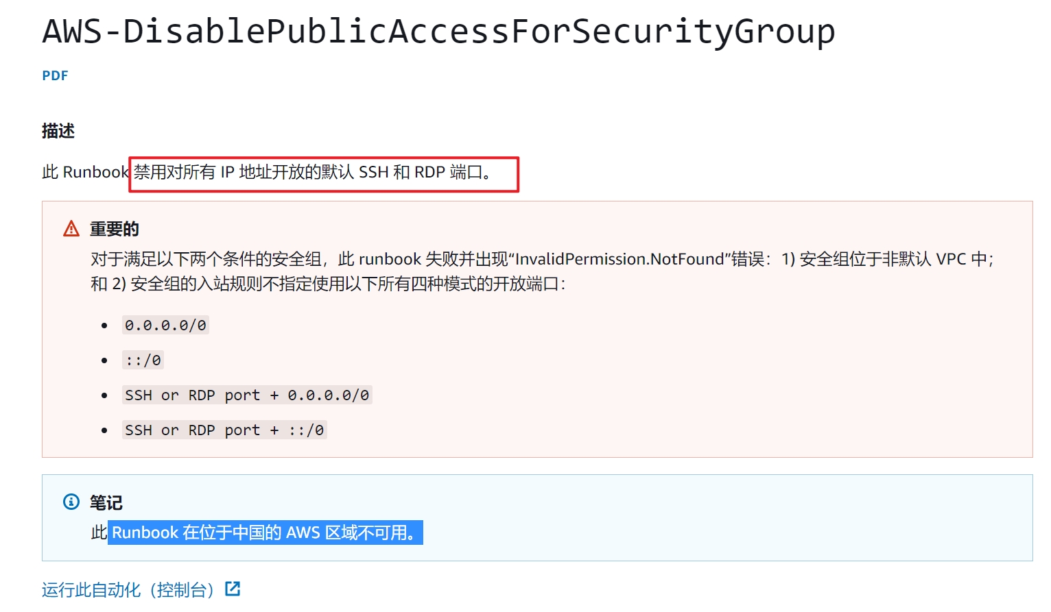 AWS-DisablePublicAccessForSecurityGrouphttps://docs.aws.amazon.com/zh_cn/systems-manager-automation-runbooks/latest/userguide/automation-aws-disablepublicaccessforsecuritygroup.html
