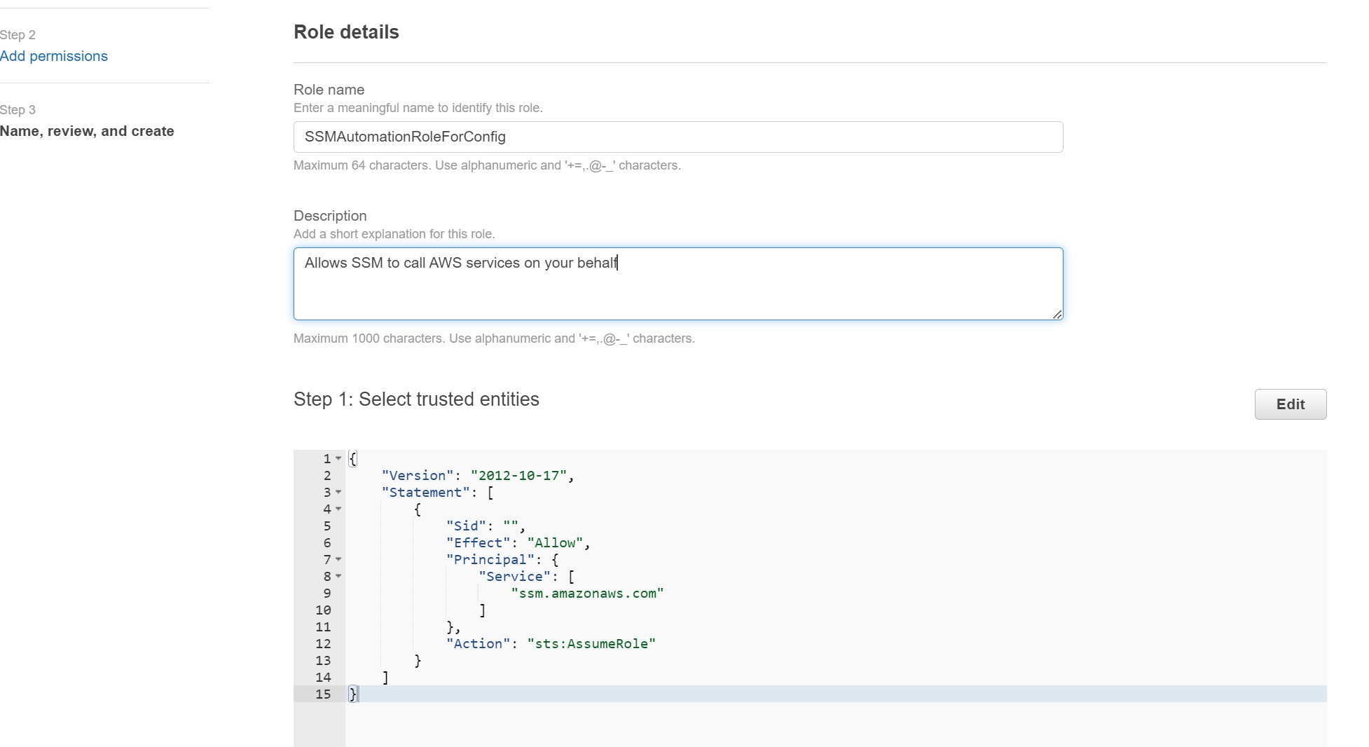 3.3 角色命名为 SSMAutomationRoleForConfig