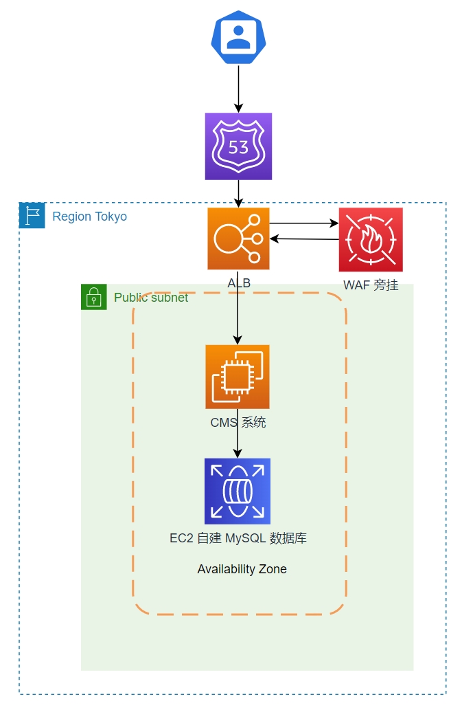 搭建了一个简单的三层架构,与以往不同的是,加上了 AWS WAF 产品,用户访问 cms.xushengjin.cn 时候,DNS 把流量转发到 ALB 中,ALB 把流量给到 WAF 做规则评估,如果为 ALLOW 就由 ALB 发送给 EC2、如果评估为 Block 结果,就 ALB 拒绝转发流量到 EC2 上